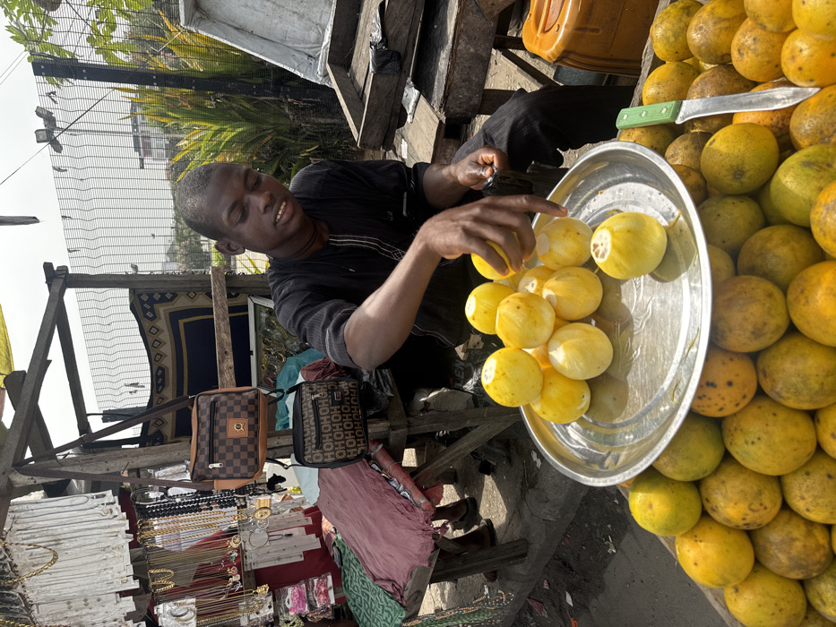 This image depicts an outdoor market stall in Lekki, Nigeria, under bright daylight
