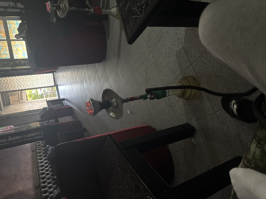 The image depicts the interior of a shisha lounge or cafe in Salé, Morocco