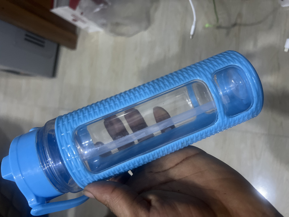 A dark-skinned individual's hand grips a clear plastic water bottle, distinguished by its light blue screw-top lid and a light blue silicone sleeve featuring a woven texture. The sleeve incorporates a clear rectangular window, revealing the bottle's interior and a transparent plastic straw positioned centrally. The bottle contains no visible liquid. The lid includes a carry handle. The scene is depicted indoors in Rumuofa, Nigeria. The background consists of a light-colored, possibly tiled, floor. Visible background elements include the white connector end of a charging cable attached to a green wire, a partially obscured white plastic bag with red lettering, and a dark rectangular object adjacent to a wooden surface.