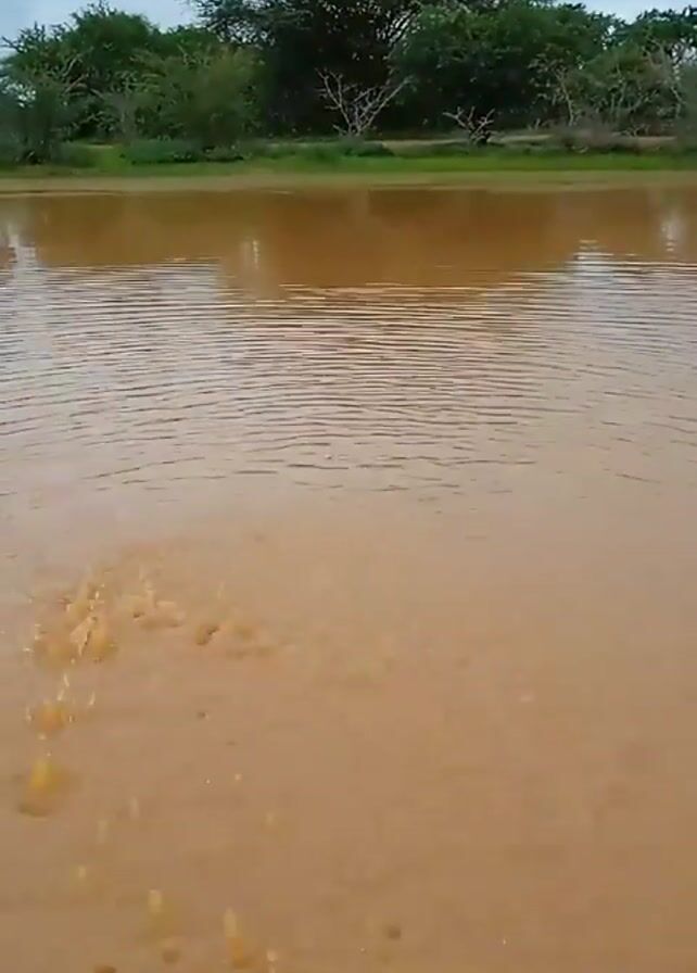 body of water with muddy brown water being splashed by an unseen force. Trees and other vegetation are visible in the background on the opposite bank of the water. The sky is overcast and grey. The droplets of water are seen suspended in the air above the water, indicating recent splashing. The video's perspective is at or near the surface of the water.