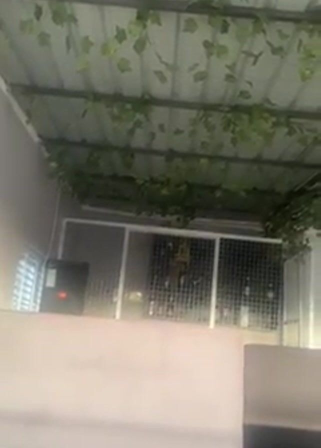interior of what appears to be a bar or restaurant, with the camera pointed upwards. The ceiling is made of corrugated metal and adorned with artificial ivy. Below the ceiling, there is a wire-mesh shelf holding various bottles. In the bottom of the frame, there's a pink wall or surface, with the shadow of artificial plants projected on it. The overall lighting is dim.