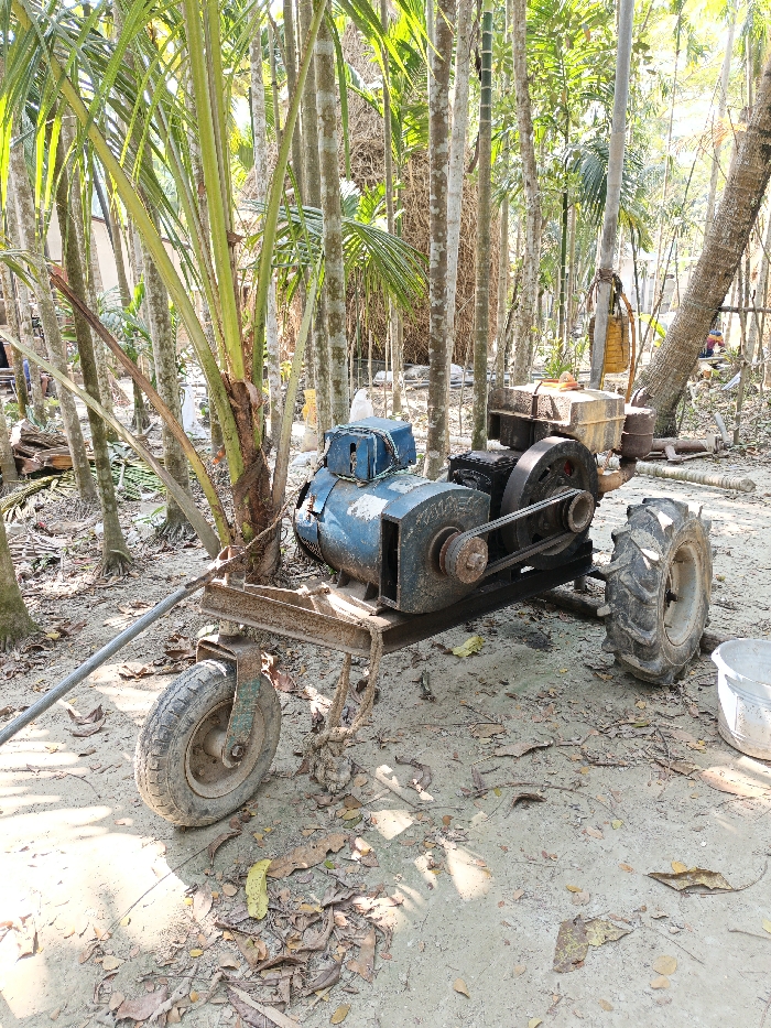 A small, weathered, homemade tractor sits amidst trees and foliage. The tractor has two large tires in the back and a smaller, single tire in the front. An electric motor, painted blue, is mounted on a steel frame. A pulley system connects the motor to the rear wheels. The ground is covered in leaves and dirt, and a white bucket sits near the tractor. The area appears to be a rural or agricultural setting.