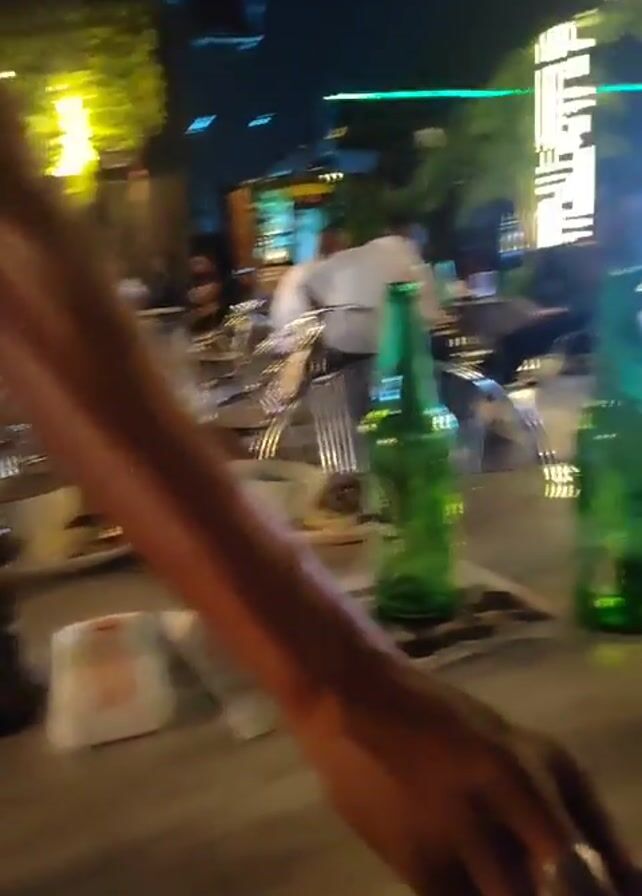 n outdoor bar or restaurant at night. People are sitting at tables, eating and drinking. The tables have metal chairs. There are green beer bottles and glasses of beer on the table in the foreground. There are also keys and a napkin on the table. The bar is decorated with lights and greenery.