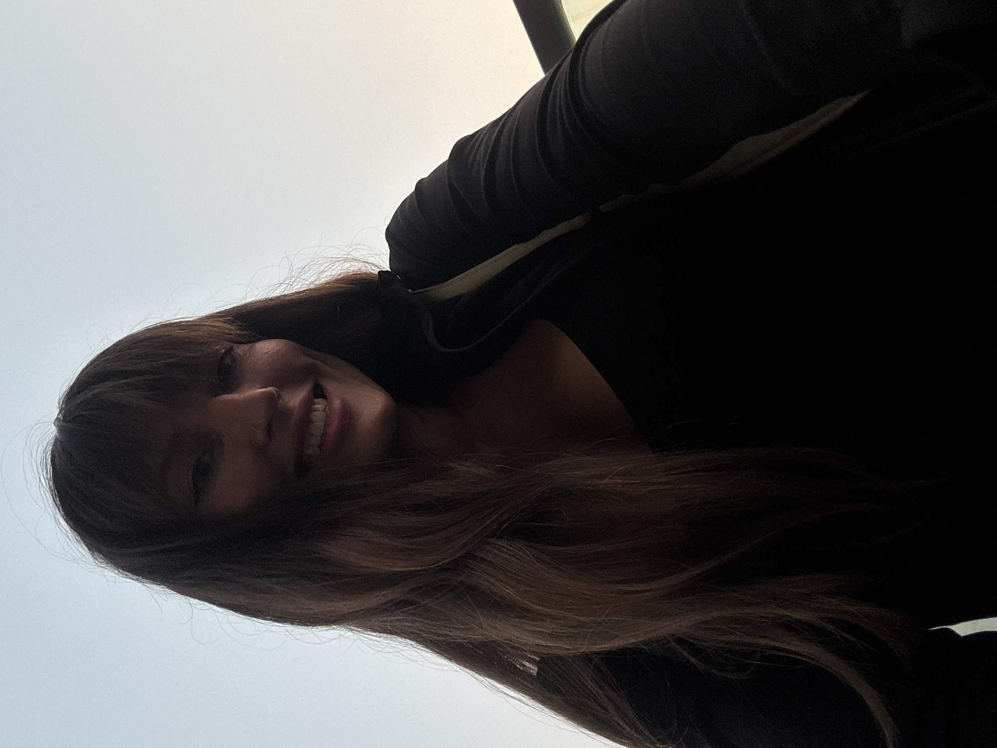 The image is a low-angle shot of a woman with long, wavy brown hair and bangs. She is smiling. She is wearing a dark-colored top and a jacket. The background is a pale sky, potentially indicating dawn or dusk. There is a vertical, dark object in the top-right corner, possibly part of a structure. Given the information provided, I cannot identify the location in the city of Đà Nẵng, Vietnam based on the visual content.