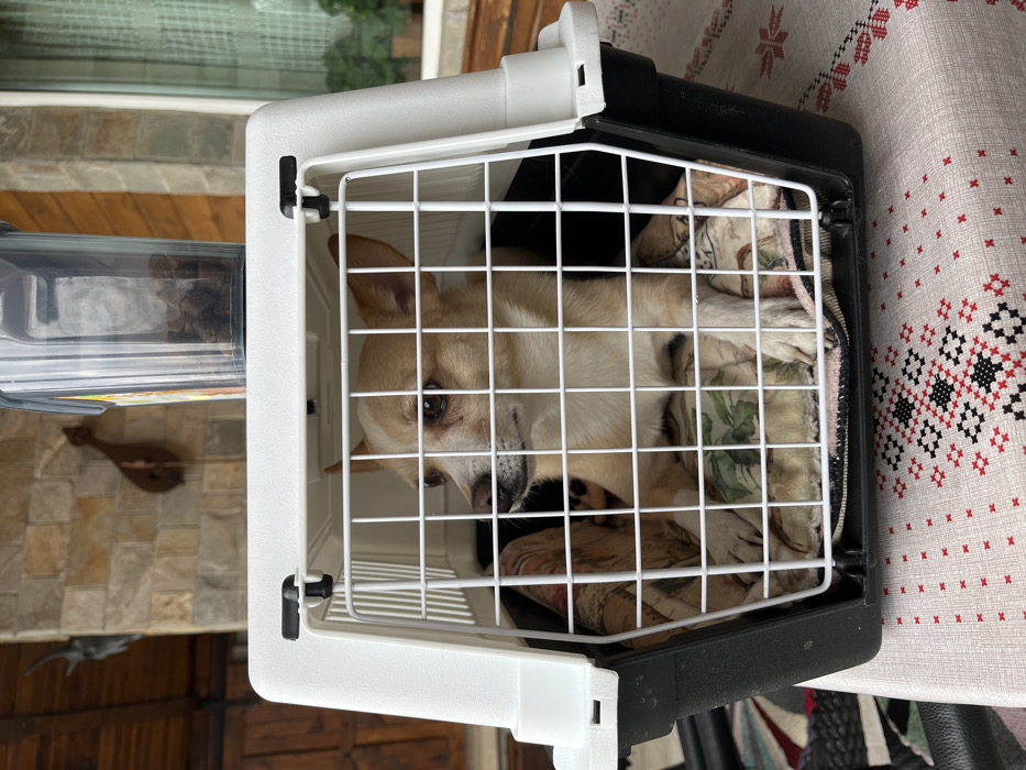 - "A light brown and white short-haired dog is contained within a white and black plastic pet carrier, positioned on a surface covered by a white tablecloth with a red and black geometric pattern" by FM-D7jTJ2, licensed under CC BY 4.0