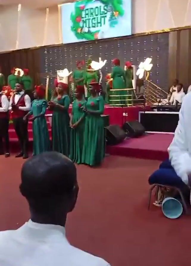 A video shows a choir in a church. A man in the foreground is filming the choir with his phone. The choir is standing on a stage and consists of men and women. The men are wearing black pants, white shirts, and red vests. The women are wearing long green dresses and red hats. A screen behind the choir displays the words "CAROLS NIGHT". The church has red carpet and ornate lighting fixtures.