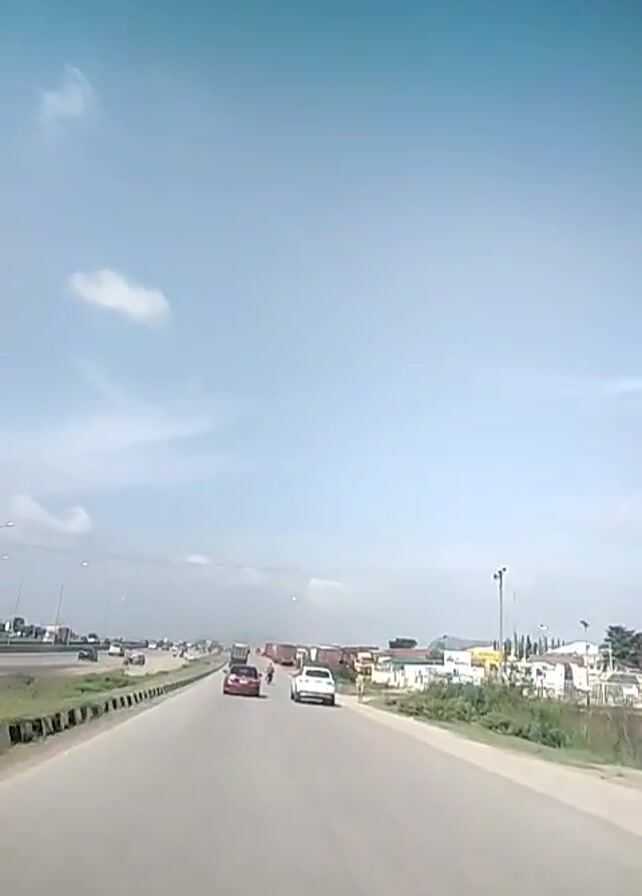 road on a sunny day with a clear blue sky and a few small clouds. Two cars, one red and one white, are driving down the road in the same direction as the camera. There are several large brown trucks parked on the side of the road. A few people and a motorcycle are visible on the side of the road as well. The road is paved and has black and white striped barriers on the left side. There are streetlights along the side of the road.