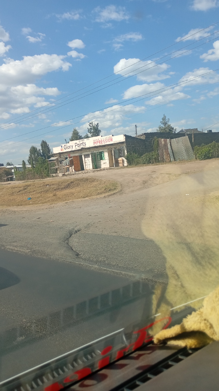 A street-level view shows a "Glory Paints" shop with the tagline "Make a Lasting Impression" under a partly cloudy sky. The shop sits on a corner, bordered by dusty dirt roads and some vegetation. Corrugated metal sheets stand adjacent to the shop. Part of the vehicle's dashboard is visible in the foreground, with some red accents and a light-colored cloth. Overhead wires stretch across the sky.