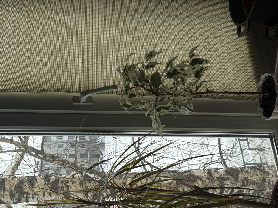 The image displays an interior perspective looking through a window in Severouralsk, Russia, under winter conditions. In the foreground, to the left, a portion of a houseplant with long, narrow, dark green and reddish-brown leaves is visible. A white PVC window frame, featuring a light grey handle on its vertical mullion, occupies the central part of the frame. A thin wire or string is stretched horizontally across the window frame at mid-height. To the right of the window frame, on an unseen surface, a smaller potted houseplant, a variegated Ficus species, stands. It has a slender brown trunk and green and white leaves, rooted in a white, fluted pot containing dark soil. Adjacent to this plant and extending rightward, a light beige, textured roller blind is partially drawn, obscuring the upper right portion of the window. Below the blind, on a dark surface, the rims of two dark, possibly cast iron, cooking pots are partially visible. The exterior view through the window reveals a snow-covered environment. Bare deciduous trees with visible bark, including a prominent birch-like trunk on the left, are laden with snow. In the mid-ground, a multi-story, light-colored apartment building, indicative of Soviet-era construction, is partially visible through the trees against an overcast sky. The ground throughout the outdoor scene is covered in a layer of snow. No individuals are present in the image.