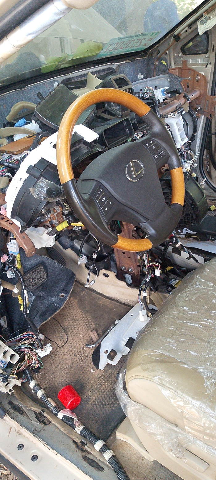 This image displays the interior of a significantly disassembled Lexus vehicle in Kubwa, Nigeria