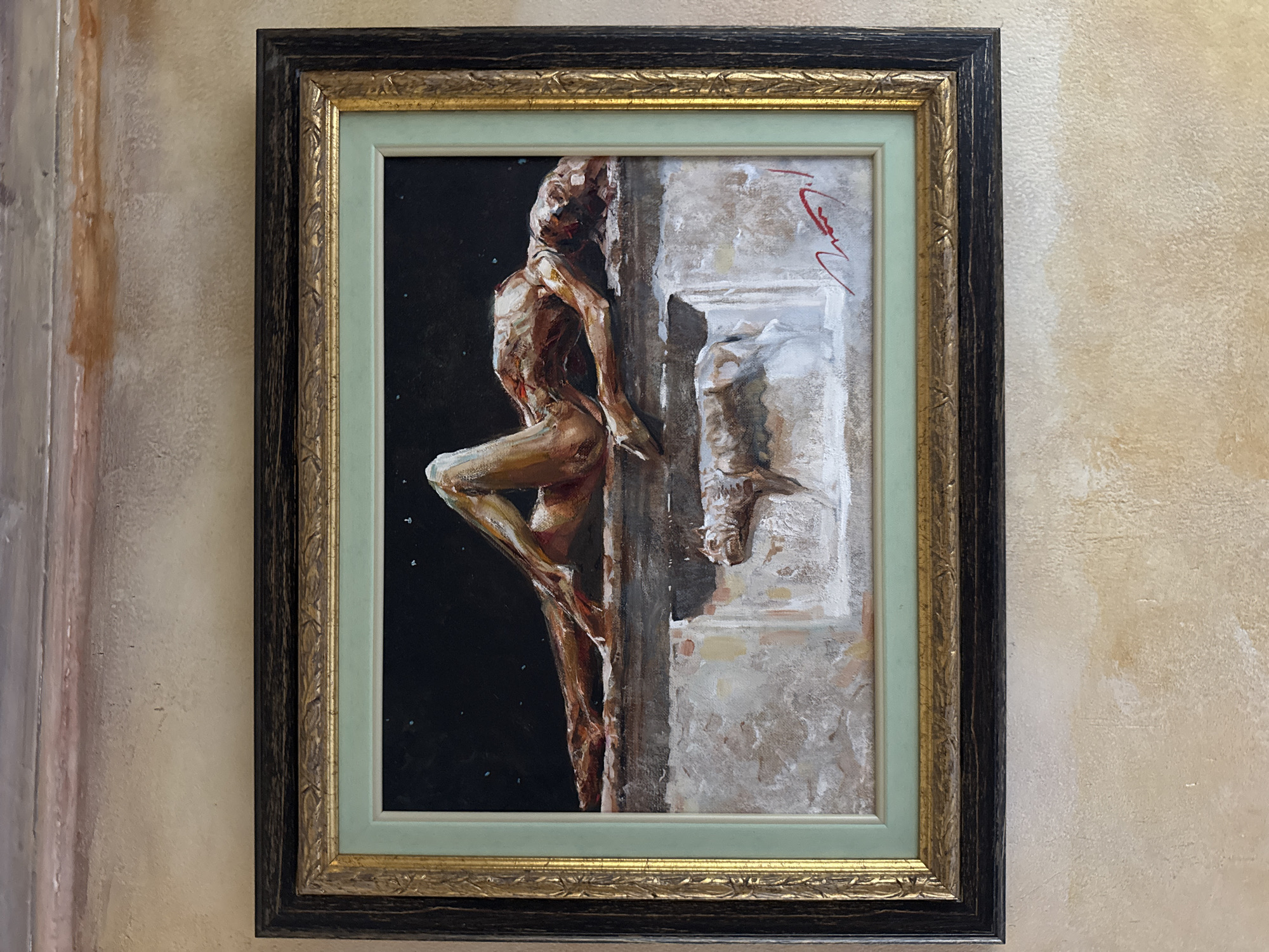 A framed painting hangs on a textured, off-white wall. The painting depicts a nude, emaciated figure clinging to a partial architectural structure, possibly a column or pilaster. The figure is positioned on the left side of the painting against a dark background, contrasting with the lighter, textured architectural element on the right. Reddish-brown brushstrokes define the figure's form. The architectural element is rendered in whites, browns, and grays, suggesting a stone or plaster material. A signature is visible in the upper right corner of the painting. The frame is ornate, with a black outer layer, a gold inner layer featuring a leaf pattern, and a thin, pale green border surrounding the painting itself. The location is Malki Chiflik, Bulgaria.