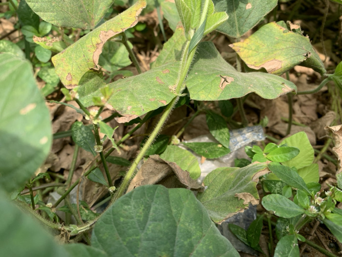 This image captures a close-up, ground-level view of a densely vegetated area in Ikot Mbonde, Nigeria. The scene is dominated by green plant foliage, primarily large leaves, many of which exhibit signs of browning, discoloration, and structural damage, consistent with environmental stress or decay. A prominent, light green, pubescent stem extends vertically from the lower center, disappearing towards the top of the frame. The ground beneath the plants is partially visible, consisting of dark soil covered with dried leaves and plant debris. Within the undergrowth, a crumpled silver-blue plastic wrapper and an amorphous piece of clear plastic refuse are discernible, indicating anthropogenic litter. No human or animal subjects are present. The environment is an outdoor setting, possibly a field or overgrown plot, characterized by natural growth intertwined with discarded man-made objects.