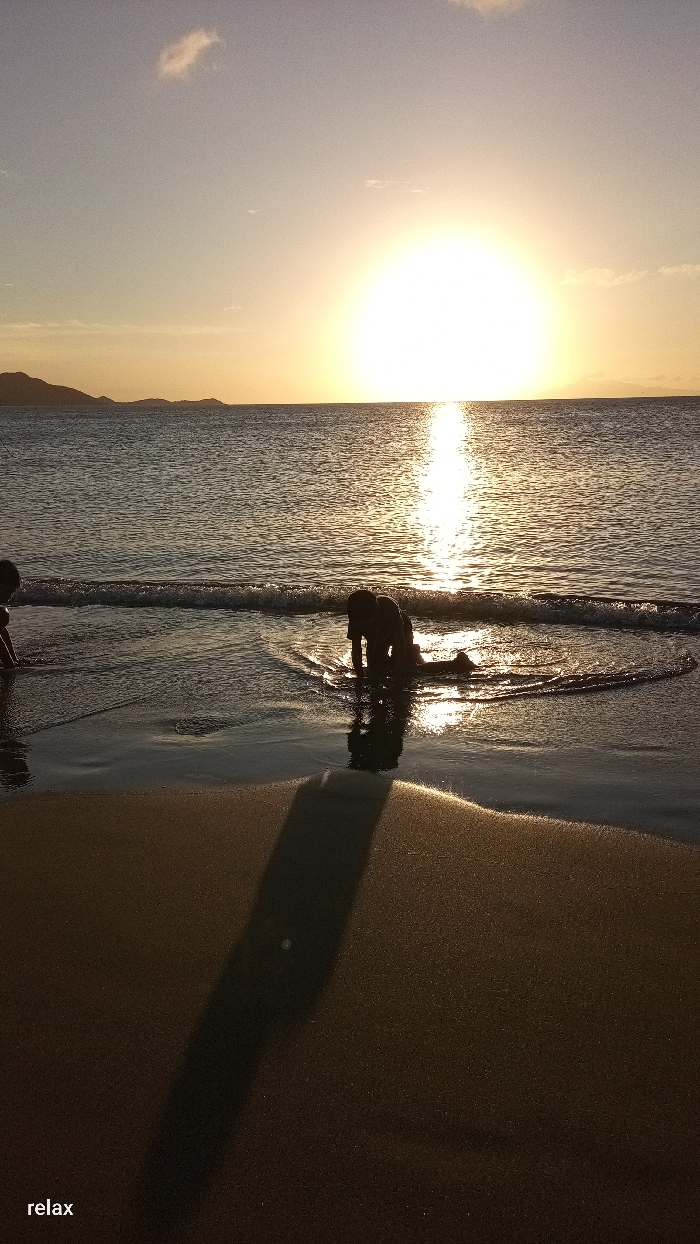 A serene sunset bathes a beach scene in warm hues. Two children are playing in the shallow water near the shoreline, creating ripples. The sun, a bright orb, reflects on the water's surface, creating a shimmering path. Distant land is visible on the horizon. A shadow stretches across the sandy beach in the foreground. The word "relax" is written in the bottom left corner.