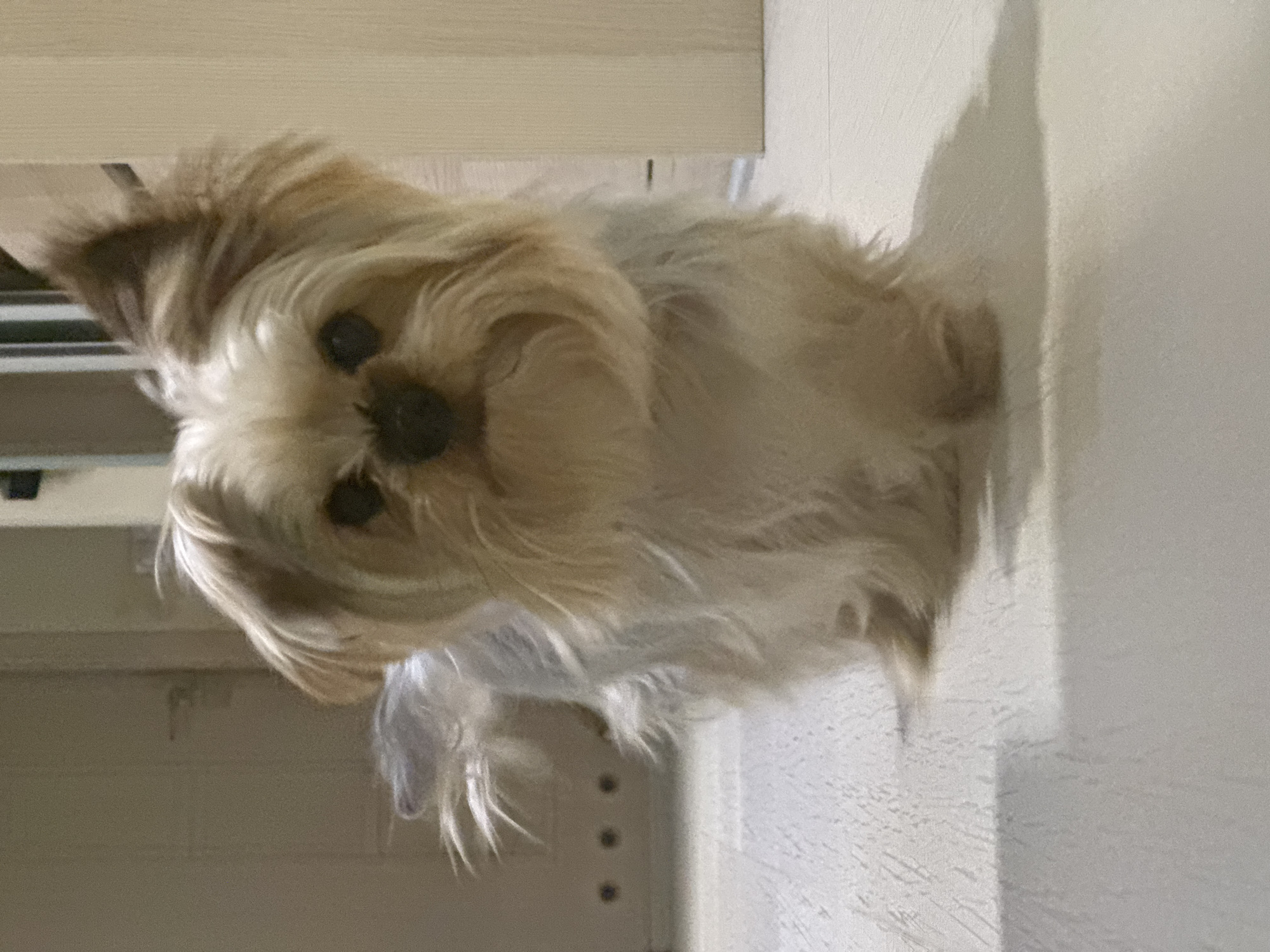 A small, long-haired, tan and white dog is positioned in front of a wall and a cabinet with a door