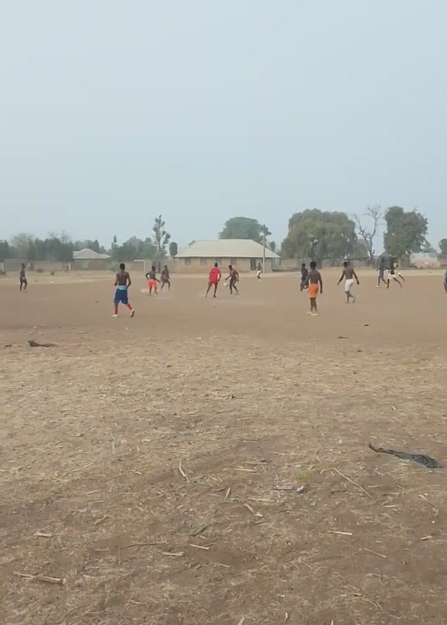 group of people playing soccer in a dirt field under a hazy, bright sky. There are around ten individuals scattered across the field, dressed in various colored clothing like red, orange, blue, and white. Some are actively running, suggesting movement and action in the game. In the distance, behind the players, a few trees and a small white building are visible, giving a sense of location. The foreground, closer to the camera, consists of dry, patchy grass and dirt, with some scattered debris or small objects on the ground. The camera position offers a wide, static view of the entire scene.