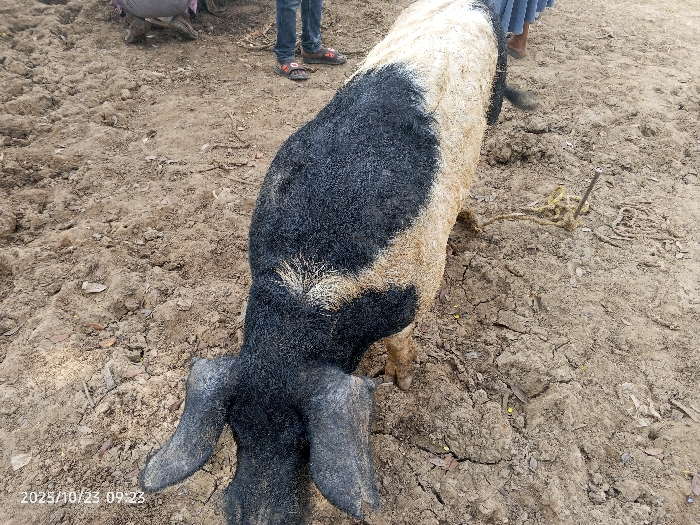 - "A domestic animal, likely a ram or goat, with black and beige/off-white patchy fur, stands on dry, cracked earth in Unguwan Rimi, Nigeria" by FM-dDsul2, licensed under CC BY 4.0