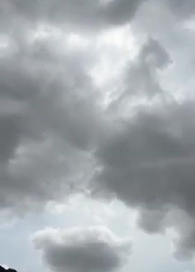 cloudy sky with a hint of sunlight peeking through. The clouds are mostly gray and cover the majority of the sky. In the lower part of the frame, a dark rooftop is visible. As the video progresses, speakers come into view, obscuring a portion of the sky.