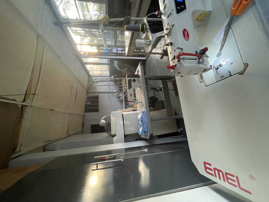 The image displays the interior of an industrial tailoring workshop located in Abuja, Nigeria. No individuals are present within the scene. In the immediate foreground, a white EMEL-branded industrial sewing machine rests on a table, featuring orange-handled scissors positioned near its illuminated needle area on a piece of white material. In the midground, another EMEL industrial sewing machine sits on a grey metal table, adjacent to a stack of folded blue fabric. To the left of this table, an ironing station with a white base holds an iron. Further right, a multi-spool thread stand displays spools of grey, yellow, and white thread. Bright natural light streams into the room through multiple windows along the right wall, revealing exterior trees and an urban environment. The ceiling is constructed from light-colored panels, several of which are visibly dislodged and sagging. The interior walls are painted in shades of grey and white, and a small, barred window is visible in the distant background.
