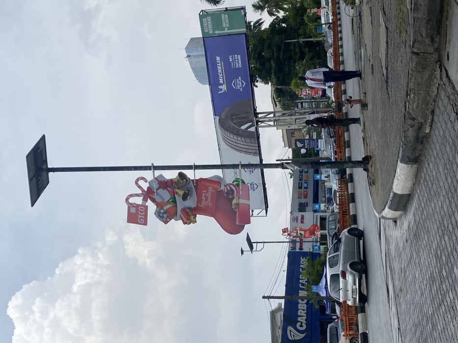 The image depicts an urban street scene in Itirin, Nigeria, under an overcast sky. A multi-lane road curves through the foreground, separated by a concrete median painted with black and white stripes, and orange and black barriers. Two solar-powered streetlights are visible, one central and another further down the street on the left. In the center, a large billboard advertisement features a red Christmas stocking filled with gifts, candy canes, and bells, bearing the text "GTCO" and "Season's Greetings." To its right, another large billboard prominently displays a "MICHELIN" tire, along with the Michelin logo and text including "A Global 99% Better Save New Life" and "THAT'S OUR STANDARD!". This billboard also includes a green directional sign pointing right to "ALFRED REWANE" and "ANYING AKALA." On the right side of the median, two adult males are standing. One, closer to the viewer, wears a white collared shirt, a red tie, and dark trousers. He is facing towards the left. The second male, positioned slightly behind and to the left of the first, wears a dark shirt and trousers and faces towards the right. A red fire hydrant is visible between them on the median. On the left side of the street, a silver Toyota Yaris/Vitz hatchback is captured in motion, heading away from the viewer. Other vehicles are present on the road and parked. In the background, buildings include "CARBON CAR CARE" with a blue facade, and signs for "Mobil," "Bosch," "Chery," and "Denso." A tall, light-colored building is visible in the distance on the right, behind the billboards and trees. Palm trees and other greenery are distributed across the scene, particularly behind the large Michelin billboard.