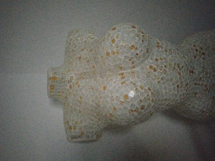 A mosaic torso sculpture rests against a pale wall. The mosaic consists of small, irregular white tiles with subtle gold flecks interspersed throughout. The sculpture is stylized, depicting the upper portion of a female form, including the chest and shoulders. The tiles create a textured, reflective surface, catching light and casting subtle shadows. The background wall is a plain, muted color that contrasts with the intricate detailing of the sculpture.