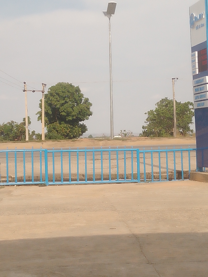 blue metal fence in front of a paved area. The fence has vertical bars and is attached to a concrete base. There is a light pole on the left side of the image, and a sign with the word "OLAY" on the right side. The sign also has a list of services, including "LUBRICANT," "MINI MART," "AUTO SERVICE," and "LARGE BAY." There are trees in the background, and the sky is clear. The scene is taken from a ground-level perspective and appears to be a gas station.