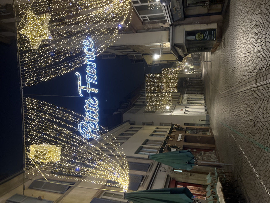 A night street view in Petite France. String lights drape above the cobblestone walkway and across buildings. "Petite France" is spelled out in glowing script. Buildings line both sides, some with closed umbrellas outside. Additional strings of lights hang further down the street. The scene is lit with a warm, festive glow.