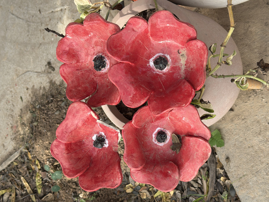 - "A top-down view features four ceramic red poppies with black centers nestled in a clay pot" by FM-grnl23, licensed under CC BY 4.0