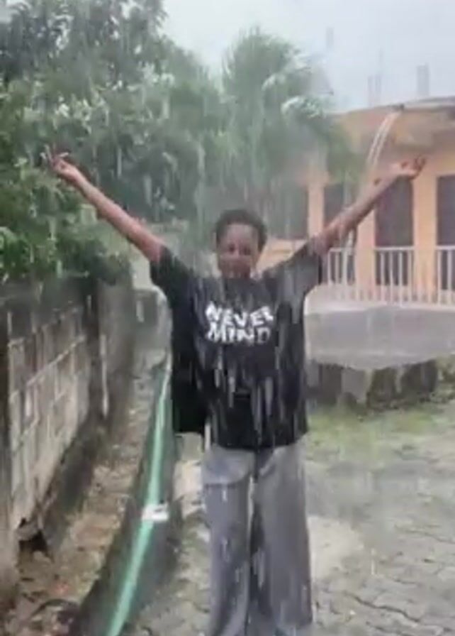 A young woman with short hair stands with her arms outstretched in heavy rain. She is wearing a black T-shirt with the words "NEVER MIND" on it and loose grey pants. She stands on a brick-paved surface. To her left is a low concrete wall and a green hose. Behind her is a two-story tan building with an orange railing. Trees and other vegetation are visible in the background. The weather is overcast and the rain is coming down hard.