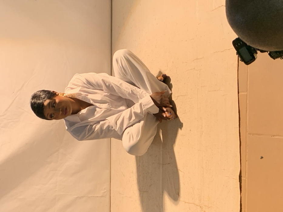 The image displays a female individual seated cross-legged on a seamless white backdrop that extends from the wall to the floor. The setting is an indoor space, likely a photography studio, in Barakin Akawo, Nigeria. The female has short, dark hair and is wearing a loose-fitting white button-up shirt and matching white trousers. She has long, golden, multi-strand earrings. Her fingernails are painted a light hue, and her toenails are painted dark purple. Her hands are clasped in front of her feet. She is looking towards the left side of the frame. Warm-toned artificial lighting illuminates the scene from the right, creating a distinct shadow of the individual on the floor to her left. In the lower right corner, a partial view of a bald head and a camera with an attached flash or accessory are visible, suggesting the presence of a photographer. The white backdrop is laid over a light brown tiled floor.