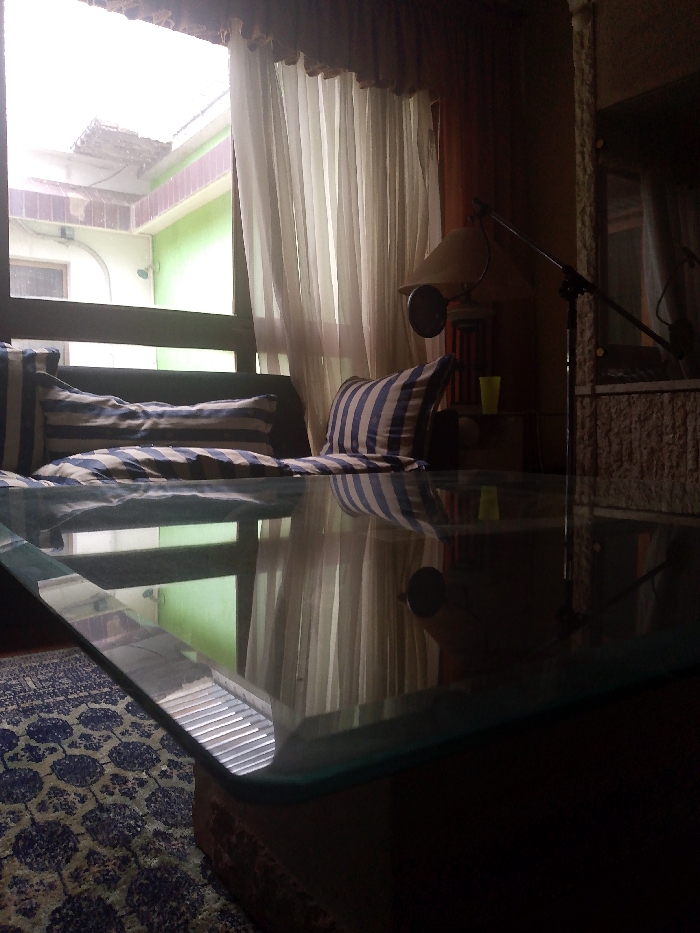 A sunlit room features a clear glass-topped table in the foreground, reflecting the room's details. Behind it, a sofa adorned with blue and white striped cushions sits before a window framed by sheer white curtains. Outside, a view of a building with green siding is visible. A floor lamp with a microphone positioned nearby stands to the right, while a patterned rug sits beneath the table.