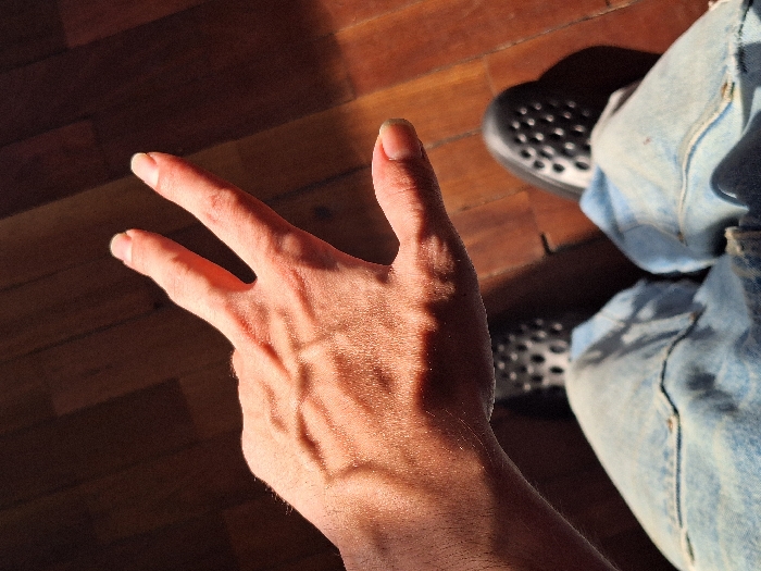 A downward-angle photograph depicts a light-skinned left hand, positioned centrally, with the index, middle, and ring fingers extended and spread, while the thumb and pinky finger are flexed. Prominent veins are visible on the dorsal surface of the hand. Strong, directional illumination from the upper left casts distinct shadows. Below the hand, the upper portions of legs clad in light blue denim jeans are visible. Further down, the front sections of two black closed-toe clogs, featuring multiple circular perforations, are observed resting on a polished wooden floor. The floor displays a warm brown tone with visible plank lines. There are no discernible visual cues within the image to specify a location in the city of Cordoba, Argentina.