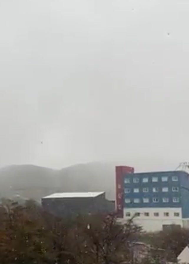 view of a town or city landscape on a snowy day. Snowflakes are visibly falling, creating a blurred effect as they are close to the lens. In the background, there is a range of hills partially obscured by the low-hanging clouds or fog. Some buildings are visible, including a prominent blue and white building with a red tower, and a dark building with a white roof. Trees in the foreground appear bare, suggesting it may be late autumn or winter. The sky is overcast and gray, and the overall impression is one of a cold and potentially dreary day.