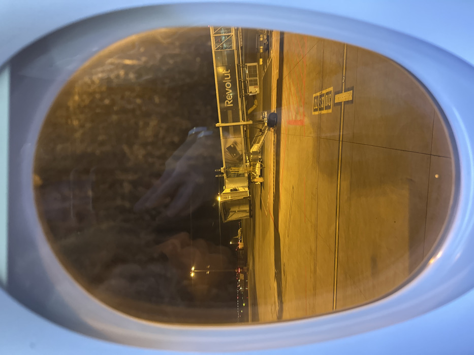- "The image displays an airport tarmac scene at night, observed from within an aircraft through an oval window" by FM-7S7sy2, licensed under CC BY 4.0