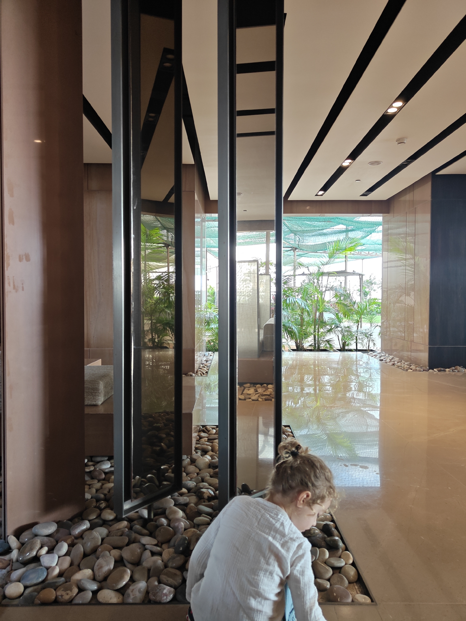 A young child with blonde hair in a bun is kneeling near an indoor rock garden in a modern, well-lit lobby. The lobby features a high ceiling with linear black accents and recessed lighting. Vertical decorative metal panels with reflective surfaces separate the indoor space from an outdoor garden area with plants, visible in the background. The floor is shiny and reflects the light and garden. The location is Mumbai, India.