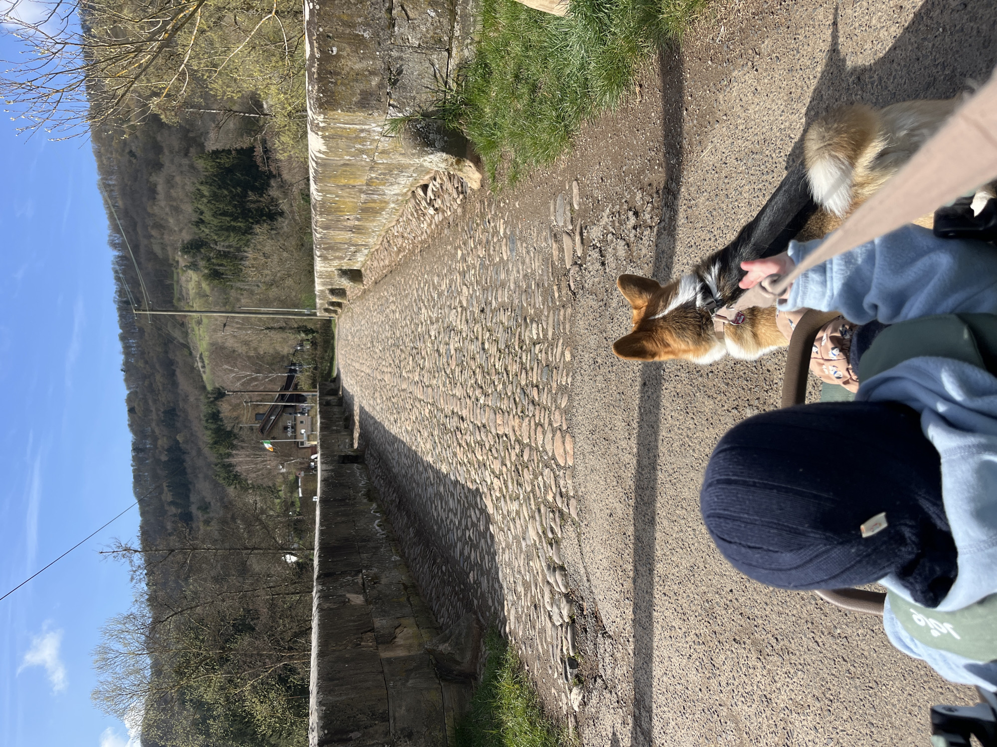 Captured from a high-angle perspective, the photograph depicts a cobblestone pathway in Raumbach, Germany. The path, characterized by irregular cobblestones, is flanked by a stone wall on one side and a raised concrete embankment on the other. A corgi stands beside a person, who is wearing a blue hoodie and a dark-colored knit cap. The person's hand touches the dog's neck, and the dog is on a leash. Beyond the path, a wooded hillside is visible, with buildings interspersed among the trees. Power lines run across the sky, which is blue with a few clouds. The scene is bathed in sunlight, casting distinct shadows on the path and surrounding structures.