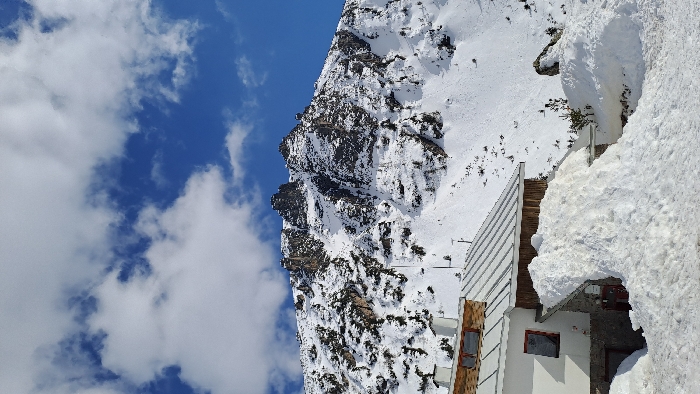 The image depicts a snow-covered mountainous landscape located in the area of Govedartsi, Bulgaria, under a bright blue sky with scattered white cumulus clouds. In the background, a rugged, snow-covered mountain features exposed dark rock formations and sparse conifer trees. Faint linear tracks are visible on the snowy slopes, and a single vertical pole, consistent with a ski lift support, stands on the right slope. In the foreground to the left, a two-story building or mountain hut with white walls and a visible stone foundation is partially obscured by a large accumulation of snow. The building has a pitched metallic roof, also lightly covered in snow. Two windows with dark frames and reddish-brown shutters are visible on the upper floor. A significant drift of snow is piled against the building's lower section, reaching up to the level of the lower windows and roof overhang. The immediate ground and surrounding areas are uniformly covered in deep snow. No individuals or specific actions are discernible within the scene.