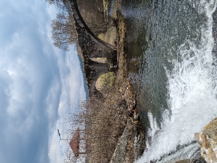 The scene depicts a natural and constructed environment in Zmeitsa, Bulgaria, under an overcast sky featuring dark grey and white clouds. In the foreground, a small weir or waterfall cascades water, generating white foam and turbulence, into a river that flows from left to right. The river's surface downstream is dark and reflective. To the mid-left, beyond dry, bare-branched vegetation, a red-roofed hexagonal gazebo with open sides is visible, positioned near a tall black street lamp. Dominating the midground, a historic stone arch bridge, composed of rough-hewn stones and featuring at least two distinct arches, spans the river. Sparse, bare trees and dry scrub vegetation line the riverbanks and surround the bridge. In the background, rolling hills or mountains with light tree cover extend beneath the cloudy horizon. An indistinct dark object is floating in the calmer section of the river, downstream from the waterfall. No human figures are present.