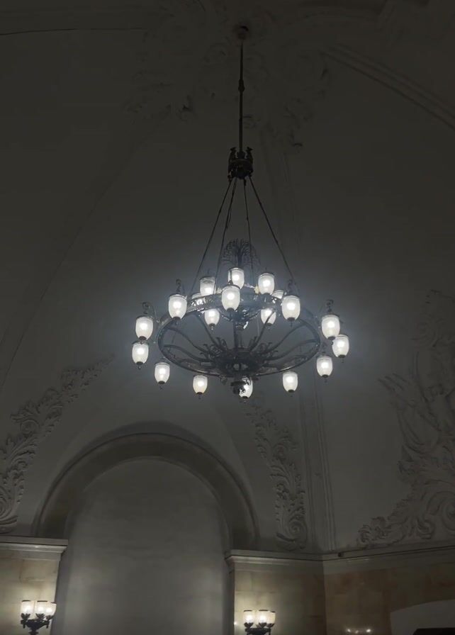 n interior shot of a building, likely a large public space such as a train station or a grand hall. The main focus is a large, ornate chandelier hanging from the arched ceiling. The chandelier has multiple lights and a metal frame. The ceiling is decorated with detailed plasterwork. In the lower part of the frame, there are arches and glimpses of people walking. A liquor/convenience shop is visible in the lower left. The lighting is dim, creating a somewhat subdued atmosphere.