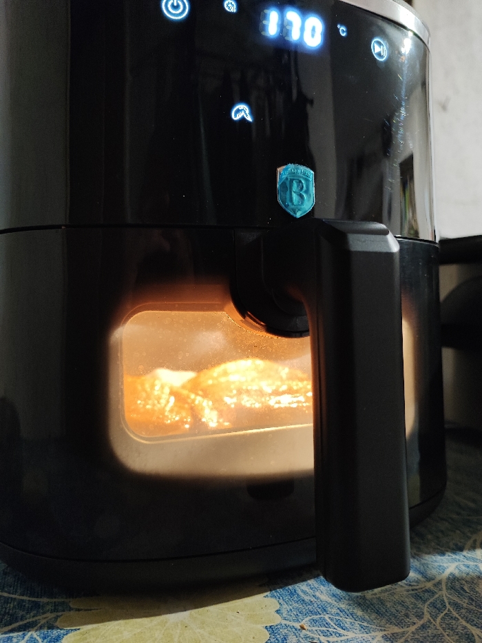 - "An upward-angled, close-up shot depicts a black Berlinger Haus air fryer in operation, situated indoors on a patterned tablecloth in Musachevo, Bulgaria" by FM-7CnuG3, licensed under CC BY 4.0