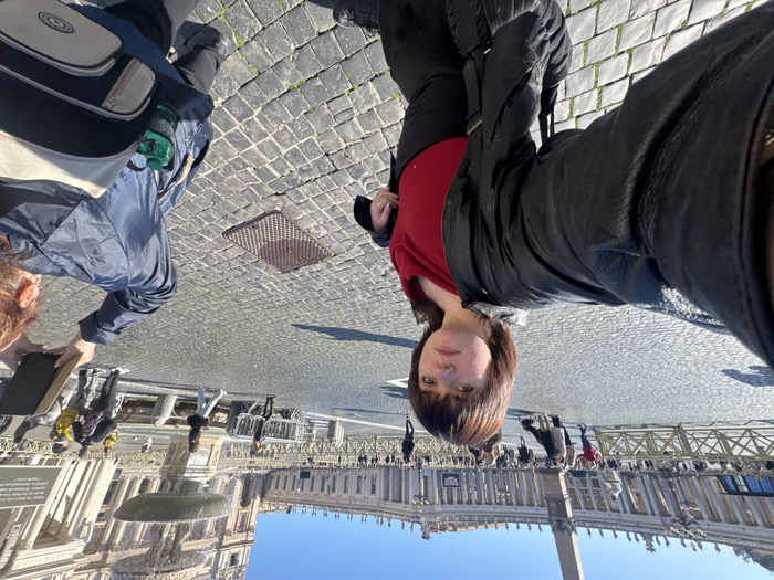 The image displays St. Peter's Square in Città del Vaticano, Vatican City, under a clear, sunny sky. In the immediate foreground, a female with short, dark brown hair, wearing a black leather jacket over a red top and dark pants, holds a camera or phone outstretched to take a selfie. To her right, the back of another individual with reddish-brown hair, wearing a blue jacket and carrying a light-colored backpack, holds a dark tablet or book upwards. The ground consists of dark grey cobblestones, with a rectangular metal grate visible in the mid-foreground. In the background, numerous people are present throughout the square. Architectural elements include the towering Egyptian obelisk, the semi-circular colonnades, and a large stone fountain actively spraying water, positioned in front of St. Peter's Basilica. Metal crowd control barriers are also visible in the mid-ground.