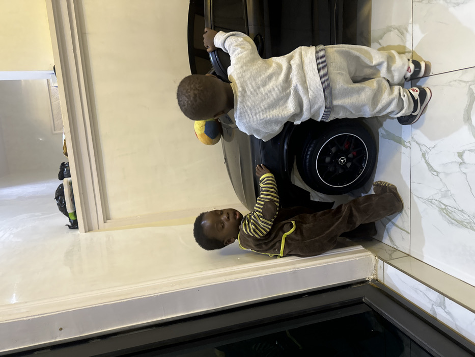 Two young children are in an indoor setting, possibly a house. One child is on top of a black toy car, wearing a light-colored waffle knit outfit with black stripes at the waist. The other child is lying on the floor in a brown jumpsuit, with a yellow trim. The floor appears to be tiled and polished. A doorway and hallway are visible in the background. The image is rotated, causing the children and car to appear sideways.