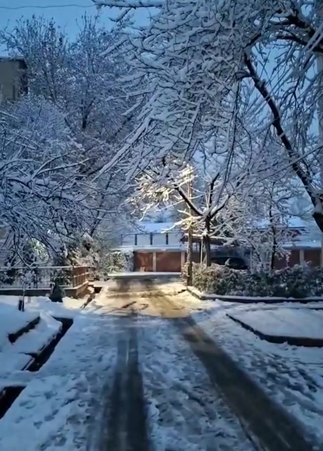 The video depicts a snow-covered alleyway or street in what appears to be a residential area during the evening or early morning hours. Snow blankets the ground, trees, and bushes, creating a wintery scene. The branches of the trees are heavily laden with snow, forming a canopy over the pathway. A street lamp shines brightly in the distance, illuminating the path ahead. Tire tracks are visible in the snow, indicating that vehicles have recently passed through the area. A building or structure can be seen in the background. The sky is a pale blue, suggesting that it is either early morning or dusk.