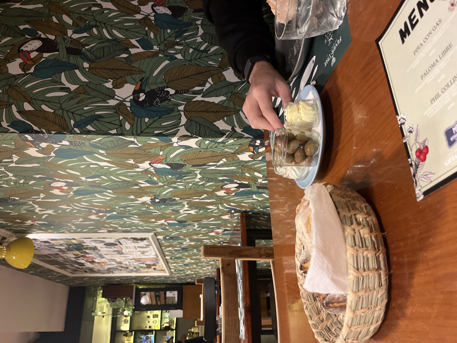 A person reaches for butter in a divided container with olives. The table is wood and holds a bread basket, a drink menu, and a glass. The wall features tropical leaf and bird wallpaper. A painting and various interior shots are visible in the background.