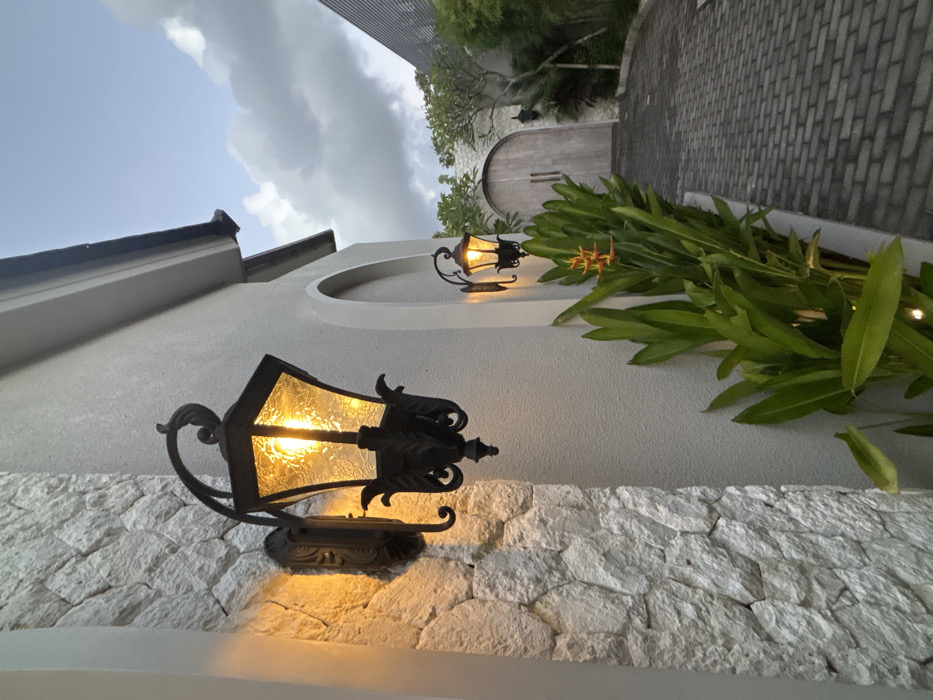 The image displays an illuminated exterior pathway in Kerobokan, Indonesia