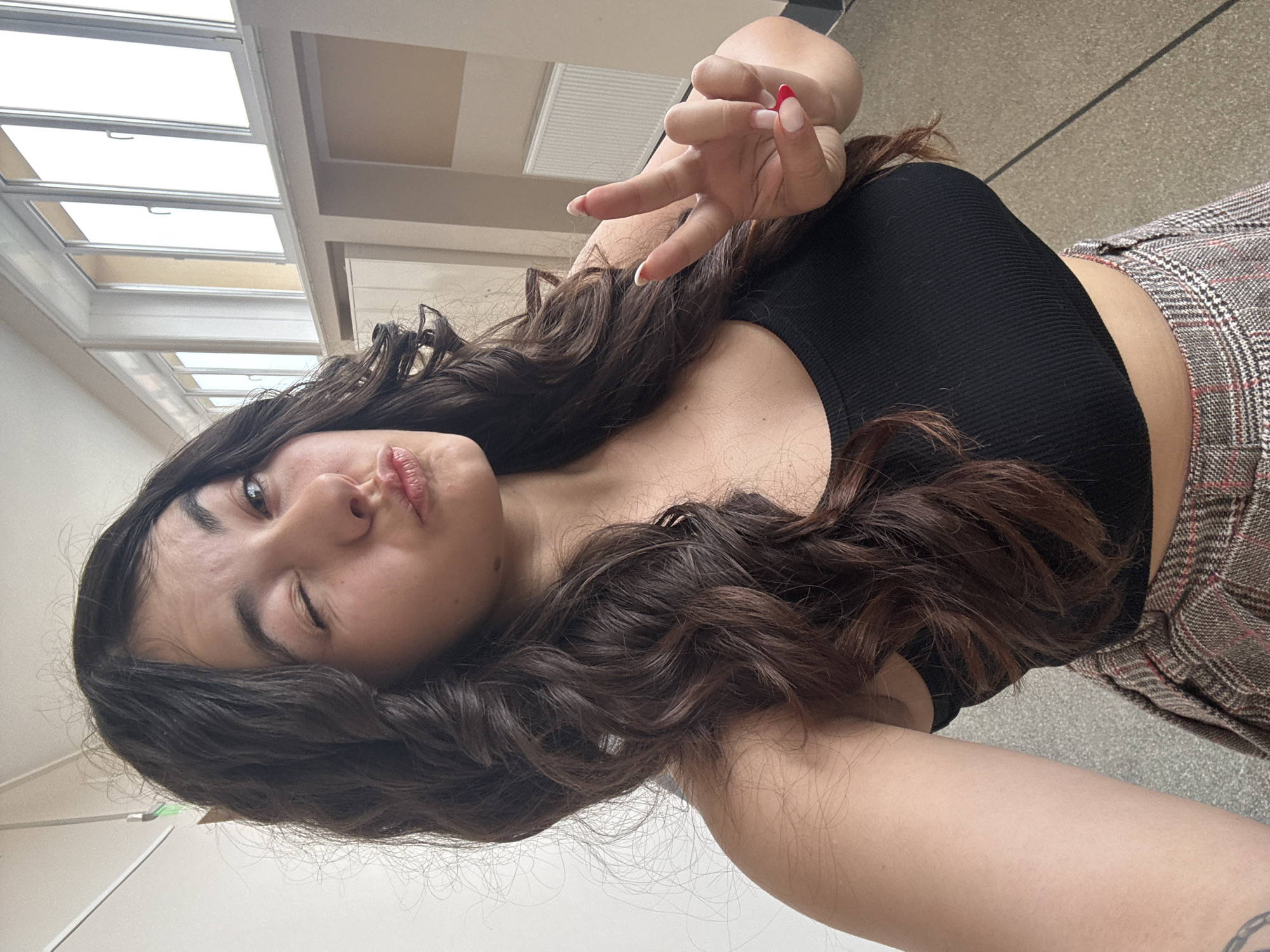 A young woman with long, wavy brown hair poses for a selfie in an interior setting. She is wearing a black, cropped tank top and a plaid skirt. Her nails are painted with a red and white French manicure. She is making a peace sign with her hand and puckering her lips for the camera. The background includes windows with skylights and a gray tiled floor. The location cannot be determined from the image.