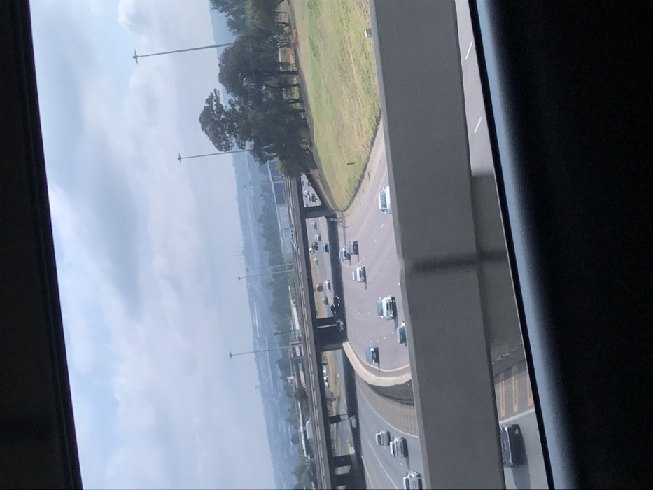 A view from a high vantage point looks down at a busy highway curving gently. Numerous vehicles, mostly white, are moving along the road. Beyond the highway is a landscape of green grass, trees, and utility poles under a cloudy sky. A distant city skyline is visible in the hazy background. The view is framed by parts of a window or structure, with a pillar visible.