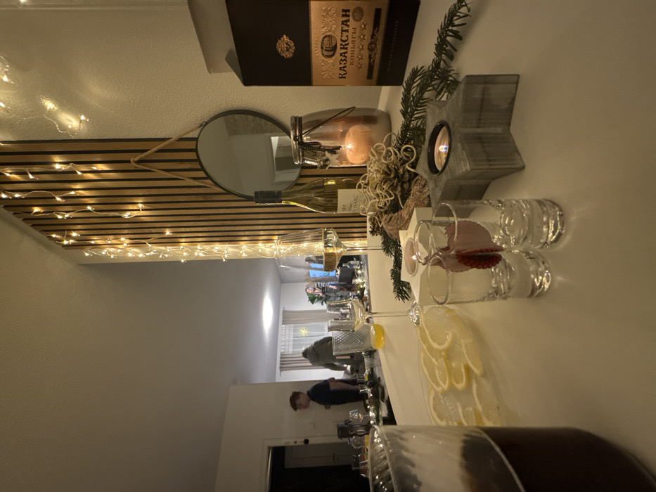 A table setting features glassware, including a large pitcher of dark liquid, wine glasses with lemon wedges, and small shot glasses. Decorative elements include a wooden box, a candle in a jar, and a star-shaped candle holder. Behind the table, a mirror hangs above a wall decorated with horizontal wooden planks and fairy lights. The reflection in the mirror shows a room with people gathered, illuminated by overhead lighting.