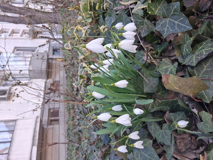 The image presents a close-up, ground-level view of an urban green space in Varna, Bulgaria. In the immediate foreground, a dense cluster of approximately 15 to 20 white, bell-shaped snowdrop (Galanthus nivalis) flowers with bright green stems is prominently featured, emerging from the ground. Surrounding the snowdrops is a ground cover consisting primarily of dark green ivy (Hedera helix) with distinctive lobed leaves, some showing lighter green or yellowish variegation. Scattered brown, dried leaves are intermingled with the ivy and bare earth. The mid-ground reveals several thin, leafless tree branches, indicative of dormant deciduous growth. In the background, a light-colored, multi-story building is visible. This structure features numerous windows, some reflecting light, and several concrete balconies. An external air conditioning unit is mounted on the building's facade. The scene is illuminated by natural daylight, suggesting late winter or early spring. No individuals, specific actions, or interactions are present in the frame.