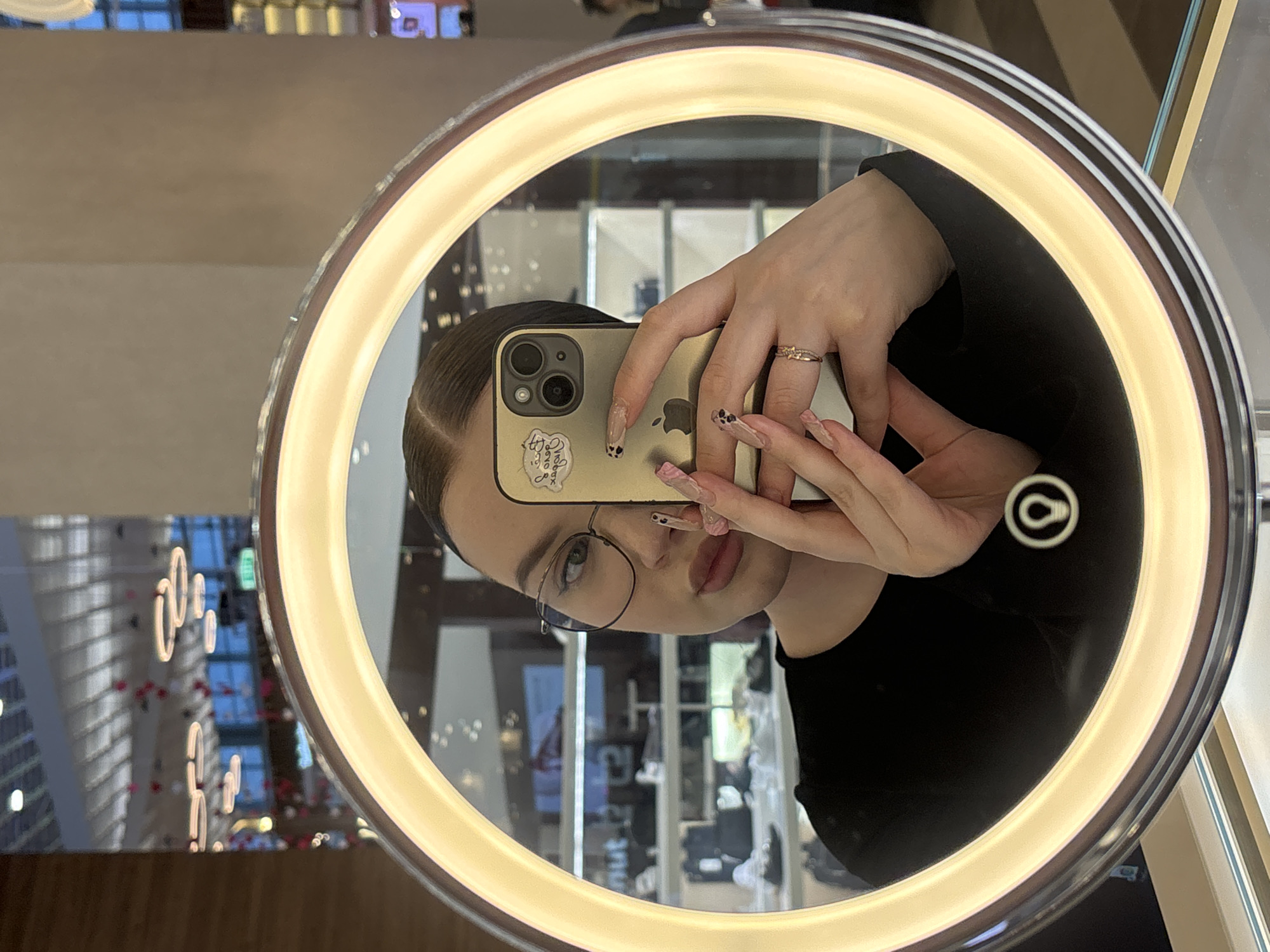 A woman is taking a selfie in a round, illuminated mirror. She holds a gold-colored smartphone, with several stickers on the back, in front of her face. She has dark hair pulled back, wears eyeglasses, and a dark-colored shirt. Her manicured fingernails are visible. The reflection in the mirror reveals part of a modern interior. Behind the woman is a view through a window, showing a modern building with distinctive architectural details, possibly located in Yekaterinburg, Russia.