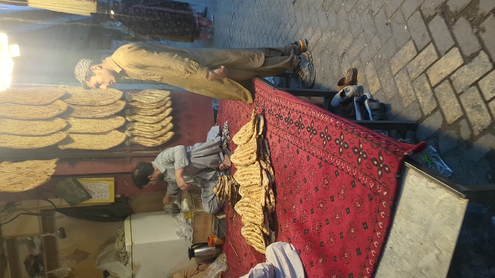 The image depicts an evening scene at a market stall or small bakery specializing in flatbreads, located in Quetta City Tehsil, Pakistan. **Personnel:** * **Individual 1 (Left):** A male individual, appearing middle-aged with dark hair, is seated cross-legged on a raised platform behind a table. He wears a light grey shalwar kameez. His bare feet are visible. He is actively engaged in an activity involving plastic bags, a metal container, and a small glass containing a yellow liquid, suggesting preparation or packaging. * **Individual 2 (Right):** A younger male individual, standing, wears a light-colored cap and a tan/khaki colored shalwar kameez. He wears dark athletic shoes with orange accents. He is positioned to the right of the table, looking towards the right side of the frame. His right hand is near his hip. * **Individuals 3 & 4 (Far Background):** Two partially obscured figures, likely women dressed in dark, patterned clothing, are visible in the poorly lit background, suggesting pedestrian traffic. **Objects and Scene Details:** * **Flatbreads:** Numerous elongated, oval-shaped flatbreads (resembling Naan or Roghni Naan) are prominently displayed. A large stack of freshly baked flatbreads rests on the red rug covering the table. More flatbreads are hanging vertically in rows along a reddish-brown wall in the background. * **Table/Platform:** A raised structure serves as a display and work surface. It is covered with a rich red rug featuring black and white geometric and floral patterns. A metal surface is visible beneath the rug on the lower left. * **Associated Items:** A black thermos/pitcher, a metal box, and a small glass with liquid are on the platform near the seated man. Plastic bags are also present. * **Wall Elements:** On the reddish-brown wall to the left of the hanging bread, a yellow-framed item (possibly a calendar or sign) is affixed. A dark jacket or garment hangs from a hook further left. * **Lighting:** An overhead light source, possibly an exposed bulb, emits a yellowish glow from the top center. Another light source is located above the seated man. * **Ground:** The ground level is paved with light-colored interlocking concrete pavers arranged in a herringbone pattern. * **Footwear:** Several pairs of shoes, including sandals and athletic shoes, are placed under the table, on the paved ground. **Actions and Interactions:** The seated male is engaged in a task involving items on the platform, while the standing male observes or waits. The arrangement of the flatbreads and the presence of packaging materials indicate a commercial setting for food sales.
